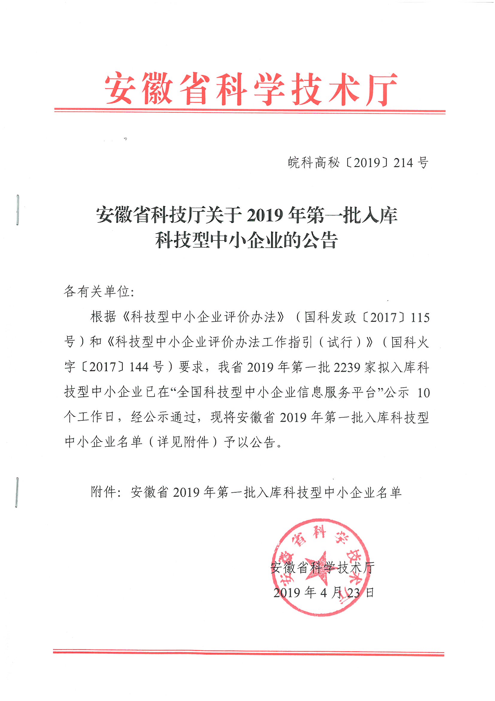 安徽省2019年第一批入庫(kù)科技型中小企業(yè)名單公告