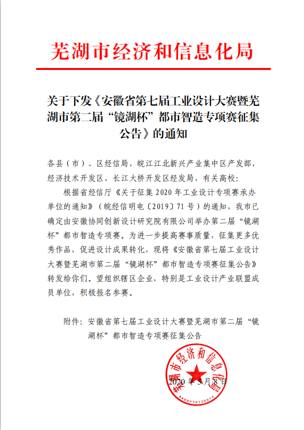 為進一步加快蕪湖市現(xiàn)代制造產(chǎn)業(yè)的升級轉型,加速工業(yè)設計與制造的融合,培養(yǎng)工業(yè)設計人才,決定舉辦安徽省第七屆工業(yè)設計大賽暨蕪湖市第二屆“鏡湖杯”都市智造專項賽。