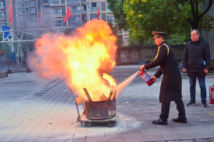 隨著警報聲的響起,進入疏散演習環(huán)節(jié),俞部長指導全員用毛巾捂住口鼻從預定疏散通道有序撤出,到達指定安全位置。在園區(qū)主廣場,俞部長講解及示范如何正確使用滅火器,指導全員如何安全、快速、有效的滅火,保障自身生命財產(chǎn)安全。